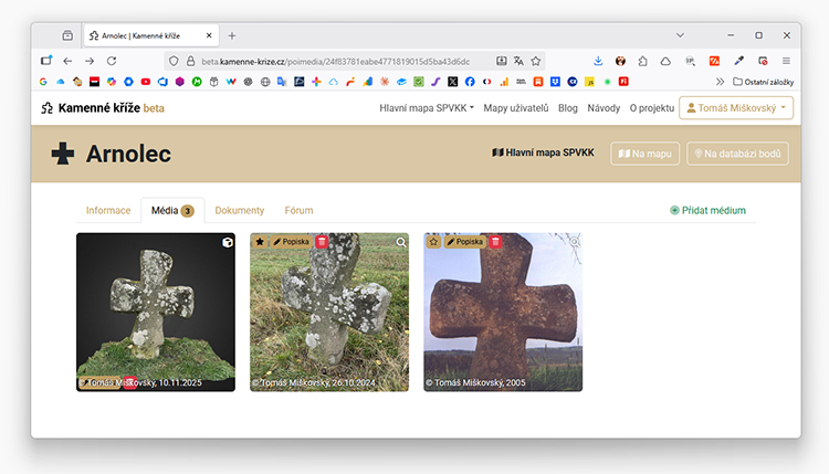 - na záložce Média jsou soustředěny všechny fotografie, 3D modely a videa uložená k dotyčnému bodu