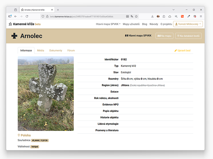 - každý bod, ať je rozkliknutý z mapy nebo databáze má svou kartu s několika záložkami. Na první z nich jsou evidenční informace.