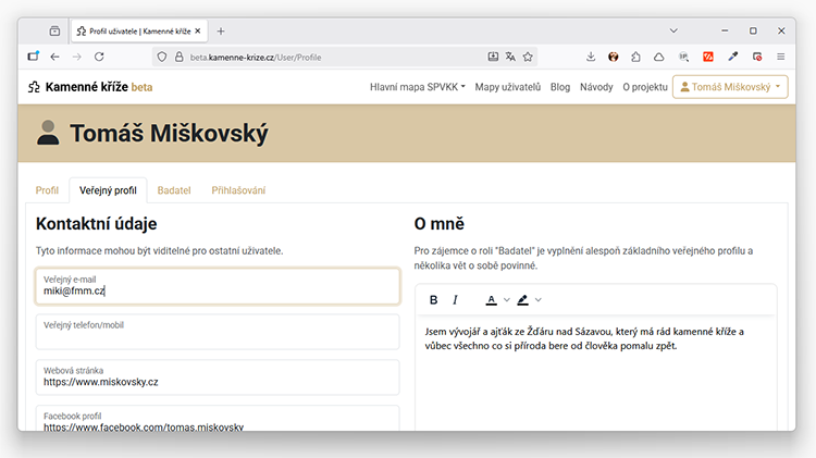 - registrovaní uživatelé mají možnost se svobodně rozhodnout jaké kontaktní údaje (a zda nějaké) o sobě zveřejní. Na stránce "Můj účet" jsou k tomu účelu připravená nepovinná pole v záložce "Veřejný profil"
