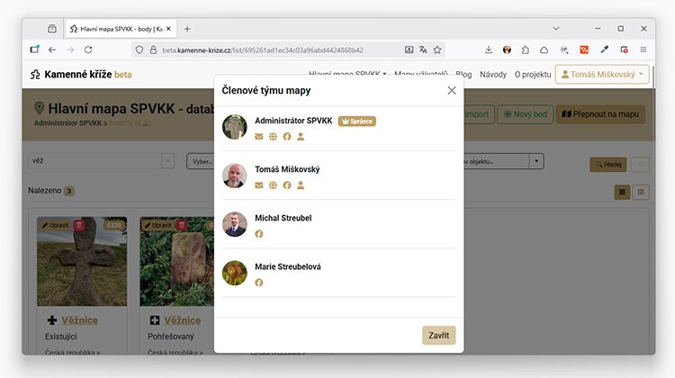- pro každou mapu může badatel definovat tým spolupracovníků, kteří mu s editací mapy mohou pomáhat