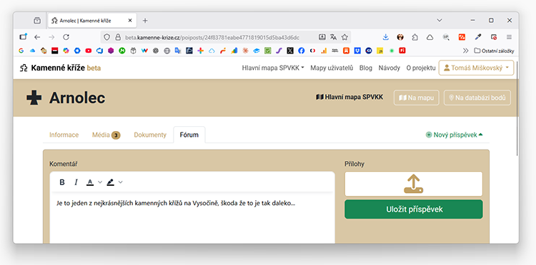 - může k jednotlivým bodům všech veřejných map/databází vkládat komentáře, včetně možnosti přiložit fotografii/ie a vlastník/správce mapy nebo člen jeho týmu může takovou fotografii zahrnout podle svého uvážení do galerie příslušného bodu