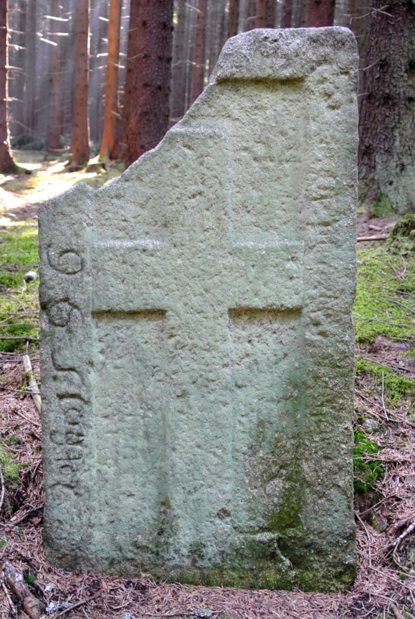 | Prameny a literatura | K. Brázda, Smírčí kameny, hraniční kameny, jiné fragmenty, kolomazné pece, 1956 - 1979, č. 1: Lávecká cesta - Kámen s plastickým křížem. Po obvodu kamene je značně nečitelný nápis, nahoře uražen, pod tím dobře čitelný letopočet 1596. Otec mi vyprávěl, že staří lidé říkali, že zde byl od pytláka zastřelen myslivec. Kámen byl prý přemístěn k cestě, před tím býval uprostřed lesa. (Rozměry 800 x 460). Průzkum. 1964 - viz náčrt a foto. Z. Procházka, † V. Navrátil, Staré kamenné kříže a křížové kameny okresu Jihlava, Vlastivědný věstník moravský, r. 1996, č. 2, str. 136-154: Další křížový kámen je zasazen při lesní cestě v prostoru mezi vrchem Jelení skok a lesem Mučírnou, asi 2 km V od města. Při okraji desky, na které je vytesán jednostranný reliéf kříže, probíhal český opis ze kterého je čitelný pouze počátek: Letha 1596... (Vn 78 cm; Š 45 cm; T 9 cm) Z. Jaroš, Pamětní kameny na Jihlavsku, Jihlava 2003, č. 123 |