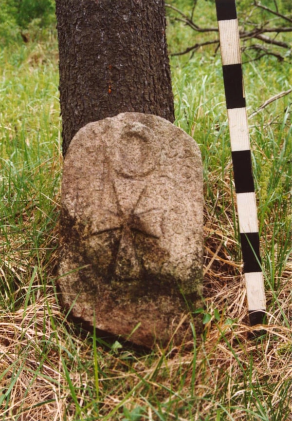 | Popis objektu | Jednostranná deska završená obloukem. Na přední straně je reliéf klínového kříže a nad ním též reliéfně vyobrazené kolo. Po stranách obou reliéfů jsou ryté iniciály a letopočty v osmi řádcích: N - O / 17 - 76 / B - L / PP - RS / W - A / ZM - … / A / Z - 1779 - B GPS kamene je orientační |