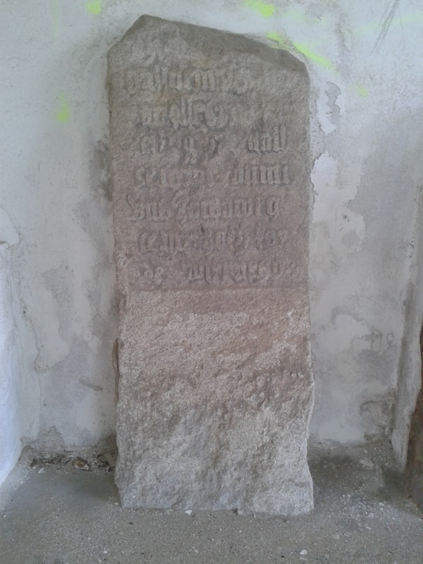 | Popis objektu | Stojí ve východní části zbylého ambitu první zleva. Oboustranný kámen se sedmi řádky gotického nápisu. Dnes je umístěný stranou s křížem ke stěně ambitu. Prvními badateli naměřená výška je zkreslená původním usazením do země, šířka odpovídá. Již při prvních soupisech byl zaznamenán jako poškozený, dříve stál u cesty z Pelhřimova do Vlásenice. |