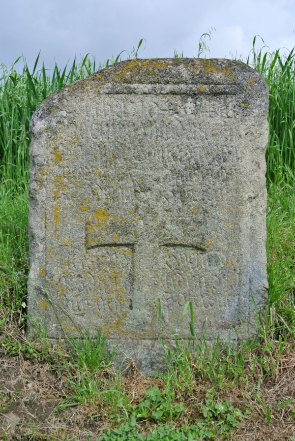 | Popis objektu | Jednostranná deska se zaoblenými hranami. Levý roh je částečně uražen. Na přední straně je v orámovaném poli v dolní části tlapatý kříž. Nad příčnými rameny je pět řádků rytého textu. Pod rameny jsou tři řádky. Dnes je čitelné pouze: "LITHA 1648 4...POCTIWI...OD DWAU SSKUDCUU KTERY PO SYLNICZYCH GEZDILY A LIDEM SSKODILY GEST ZASTRZELEN". Podle T. Karla zněl nápis, když byl ještě čitelný takto: "LETHA 1648 4 DUBNA POCTIVÝ JEDEN MLÁDENEC BABTISTA KONRADŮ NÁSILNĚ POBRANEJ NA TOMTO MÍSTĚ OD DVOU ŠKŮDCŮ KTEŘÍ PO SILNICÍCH JEZDILI A LIDEM ŠKODILI JEST ZASTŘELEN". |