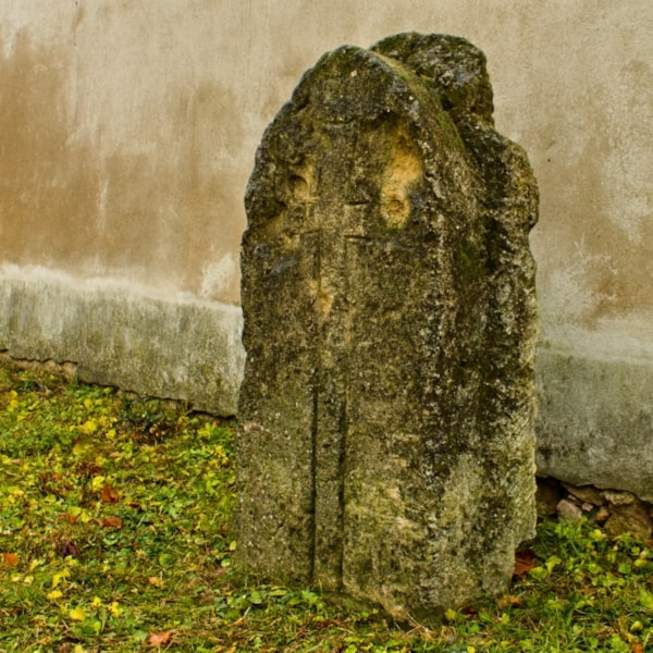 | Popis objektu | Stojí u vnitřní strany ohradní zdi areálu kostela svatých Petra a Pavla v centru obce (naproti Vzhledově rustikální vápencová, navětralá deska s opracovanou přední částí vystupující z neopracované a obrysově přečnívající zadní masy. Opracovaná část je směrem vzhůru zakončena lomeným obloukem, stylově odpovídajícím pozdní gotice. Zřejmě podle toho byl kámen předběžně datován do 15.století. V čelní stěně je obrysový reliéf latinského kříže s mírně se rozšiřujícími břevny, konkávně zakončenými. V ploše jsou nepatrné, při povrchním pohledu neznatelné stopy po několikařádkovém nápisu provedeném kapitálkami. Text nelze dešifrovat ani s určitostí říci, zda je původní či druhotný. Pod pravým břevnem kříže je náznak obrysového reliéfu kruhovitého tvaru. Čelní strana kamene je poškozena několika kruhovitými prohlubněmi, pravděpodobně způsobenými manipulací (špicí krompáče nebo drapáky bagrové lžíce) během restauračních prací na soše sv.Tekly. |