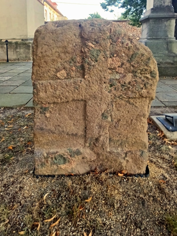 | Popis objektu | V intravilánu obce, před kostelem sv.Markéty. Nepravidelně obdélníková deska z načervenalého pískovce s jedním horním rohem ulomeným. Z líce i rubu kamene vystupuje stejný reliéf latinského kříže na obdélníkovém podstavci. Reliéf je na jedné z ploch v místě křížení ramen mechanicky poškozen. |