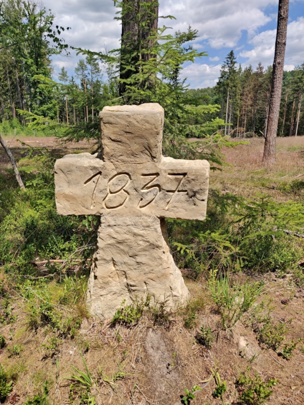 | Popis objektu | Kopie kamenného pískovcového kříže s klínovou základnou a letopočtem na přední straně1837 a na zadní straně rytinou meče. Kříž je přezdívaný jako Verunčin a se nachází u křižovatky lesních cest na okraji vysokého lesa vedle u význačného stromu " Borovice u obrázku" SV od Růžové |