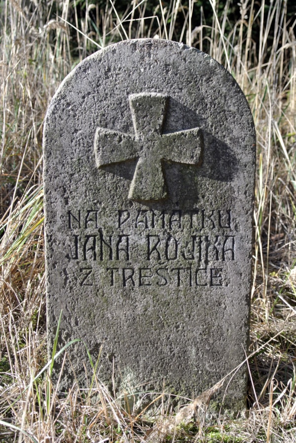 | Popis objektu | Jednostranná deska se zakulaceným temenem. Na přední straně je v horní polovině plochy reliéf klínového kříže se zakulacenými konci břeven. Pod křížem je zhruba ve středu plochy rytý nápis: „NA PAMÁTKU / JANA ROJÍKA / Z TŘEŠTICE“. |