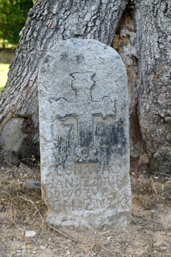 | Popis objektu | Na kameni je reliéf kříže a letopočet 1709. Pod ním je vyryta lebka se zkříženými hnáty. Pod rameny je vyryt dělený text: "17-09/TV-TO/SCON.WAC/HAN:ZMA:BE/ OD WOZV ZAB:/T:H:ZNEK". |