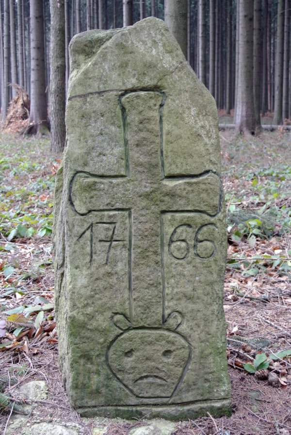 | Popis objektu | Jednostranný kamenný kvádr s nepravidelným temenem. Na přední straně je rytý obrys berličkového kříže. Pod jehož břevny je rytý dělený letopočet 1766. Pod křížem je rytý symbol lebky. |