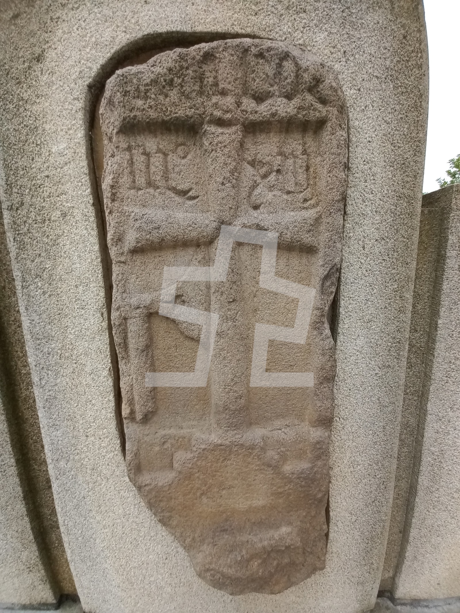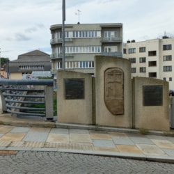 Zdá se, že jde o nejstarší plastiku v Německém Brodě; tvoří ji do země zasazený pískovcový kámen, stojící u mladého stromku, který je vysoký 2′ 6″ (asi 80 cm) a silný 1′ 6″ (asi 47 cm). Jeho přední stranu zdobí kříž spolu s (genfskou) sekerou a stěží čitelnými slovy. Kámen se ostatně zdá být starým hraničním kamenem.