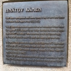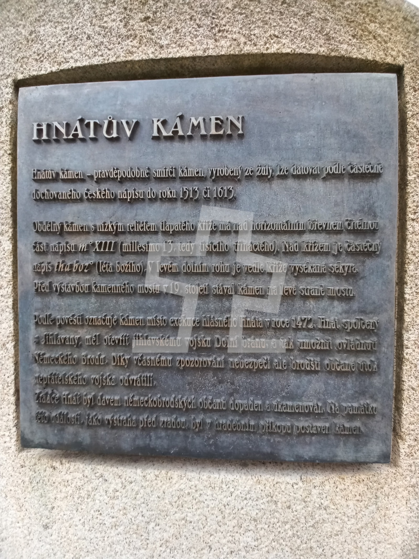 Český překlad textu B. Bernau, Die Burg Lipnic bei Deutsch Brod: Kamenný most přes řeku, dlouhý 96 kroků, byl teprve před několika lety nově vystavěn. Na konci uličky, která k němu vedla, stála dříve dobře opevněná „dolní brána“, odkud byl svržen dolů Hnát, zrádce. Tento ničema si, jak již bylo vyprávěno, umínil zradit své rodné město tak, že by je v noční době vydal Slovanům pomocí znamení zvonem, byl však včas přistižen a bez dlouhého procesu, podle staročeského způsobu, svržen do hlubokého příkopu. Již dříve zmíněný, podle pověsti tuto událost připomínající památník a symbol Německého Brodu stojí vlevo od zábradlí mostu na tomto břehu řeky.